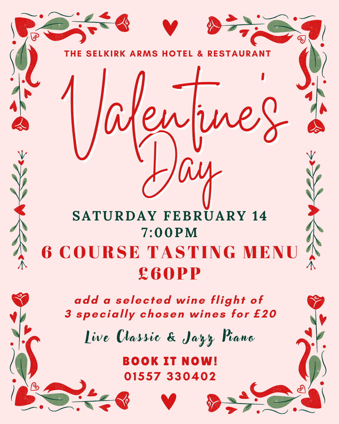 Come and enjoy a relaxed evening with a 6 course gourmet tasting menu accompanied by classic and Jazz pianist in a romantic cosy setting here at The Selkirk Arms Hotel. £60pp with the option for an additional 3 wine flight for £20. Our menu will be published early January 2026 for this event but will include a vegetarian taster option too.